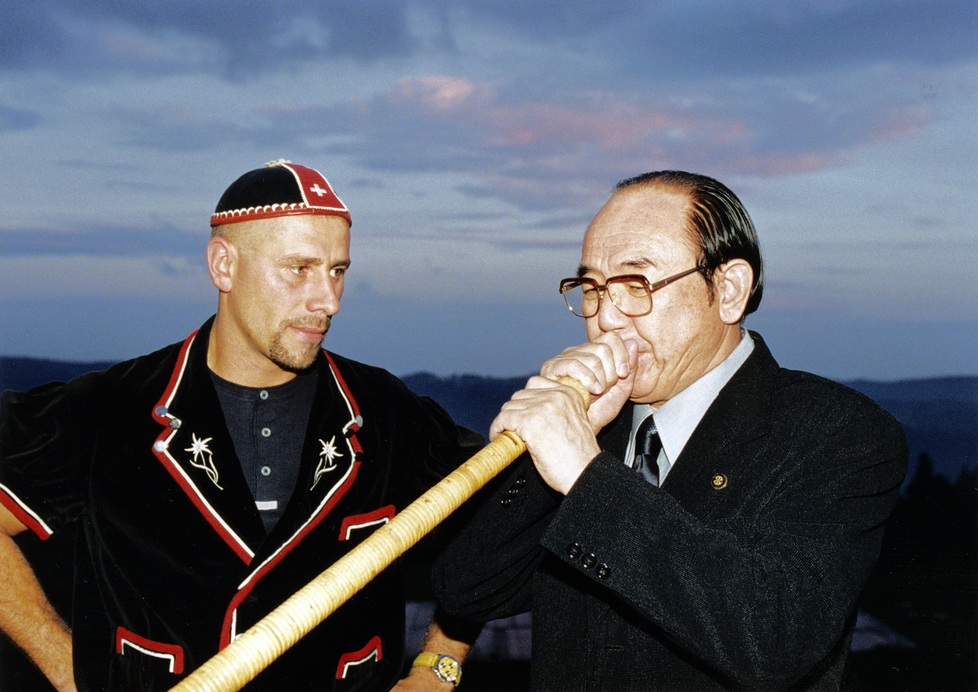 2000年にヌーシャテルで開催された会議でアルプホルンの吹き方を学ぶ新城市の山本芳央市長 (©ヌーシャテル市)