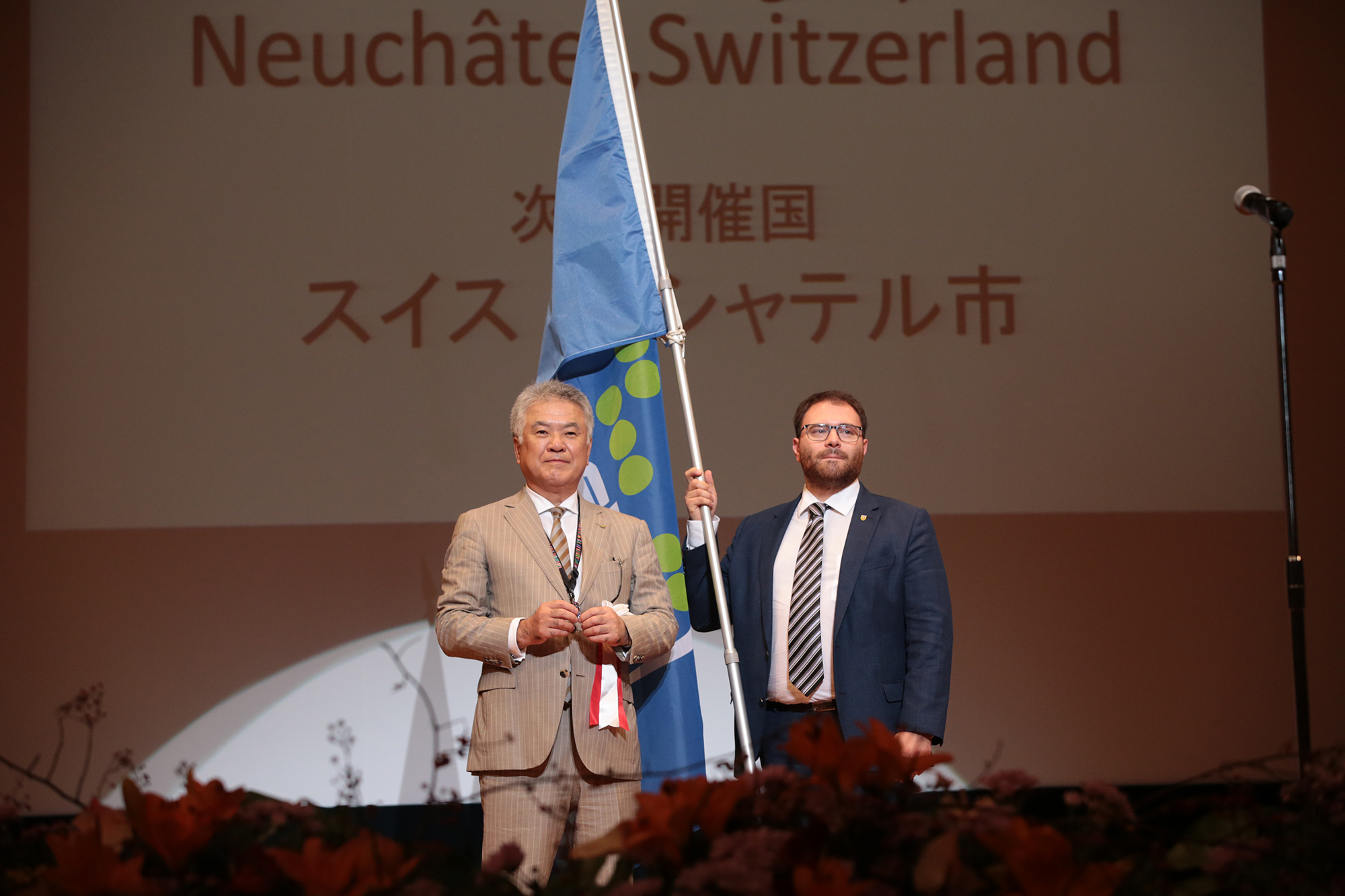 2018年10月:ヌーシャテルが2020年世界新城サミット開催地に正式に決まったことを発表する新城市の穂積亮次市長とヌーシャテル市議会議員ファビオ・ボンジョヴァンニ氏 (©新城市)